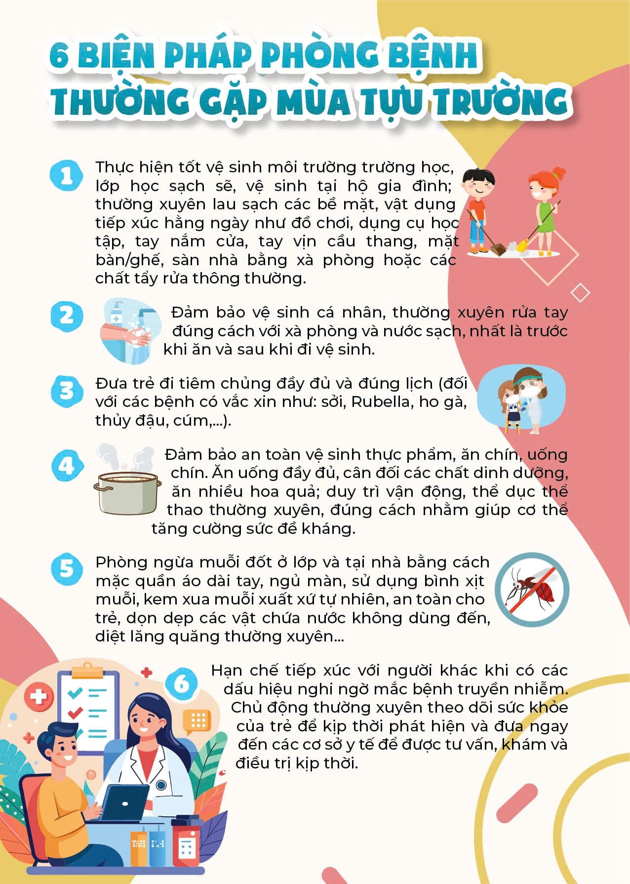 Để phòng bệnh thường gặp mùa tựu trường, phụ huynh cần chú trọng vệ sinh cá nhân, tăng cường dinh dưỡng và sức đề kháng, rèn luyện thói quen sinh hoạt, tiêm chủng đầy đủ và phòng tránh lây lan bệnh. Các biện pháp này giúp trẻ giảm nguy cơ mắc các bệnh hô hấp, tiêu hóa và lây nhiễm khi tiếp xúc nhiều với môi trường đông người tại trường học.